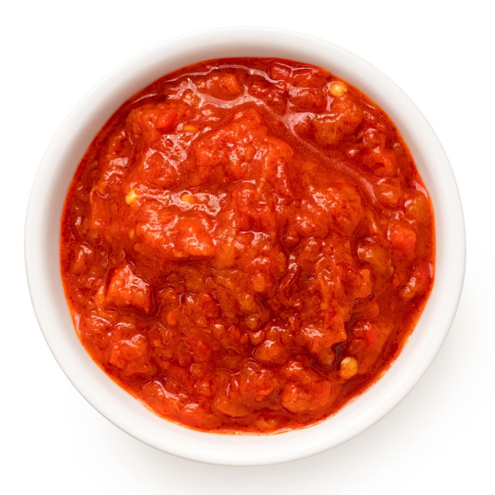 Ajvar is a great no-tomato substitute for tomato sauce, thanks to its sweet, tangy, smoky aroma. This condiment is made from roasted red peppers and eggplant, and it’s traditional in Serbia and popular across the Balkan region. However, ajvar has a thicker consistency than tomato sauce.