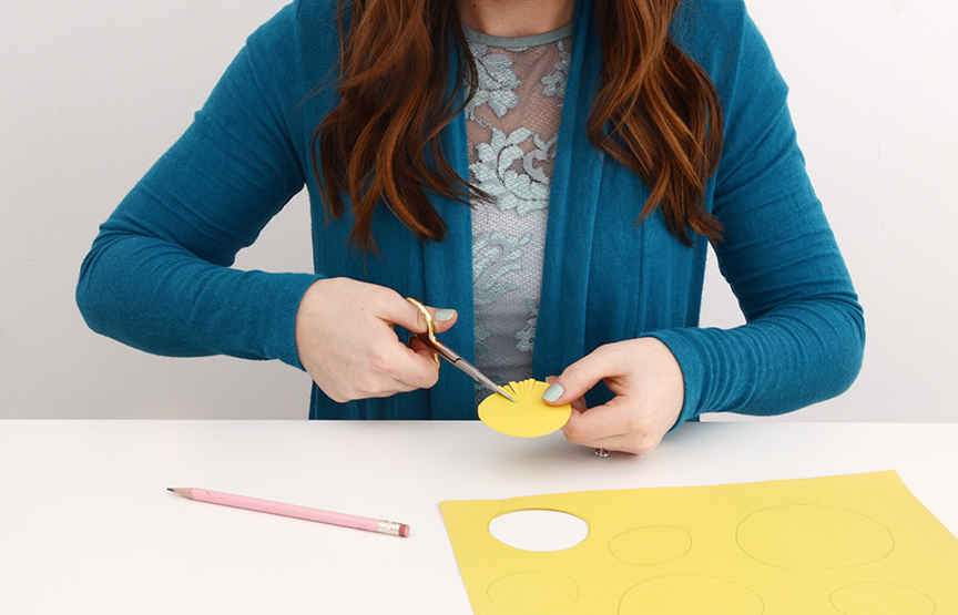 - Prepare the stamens: Cut a circle with a 3-in (8-cm) diameter from yellow paper and make 2-in (5-cm) thin fringes along its edge. Fold the fringes upwards.