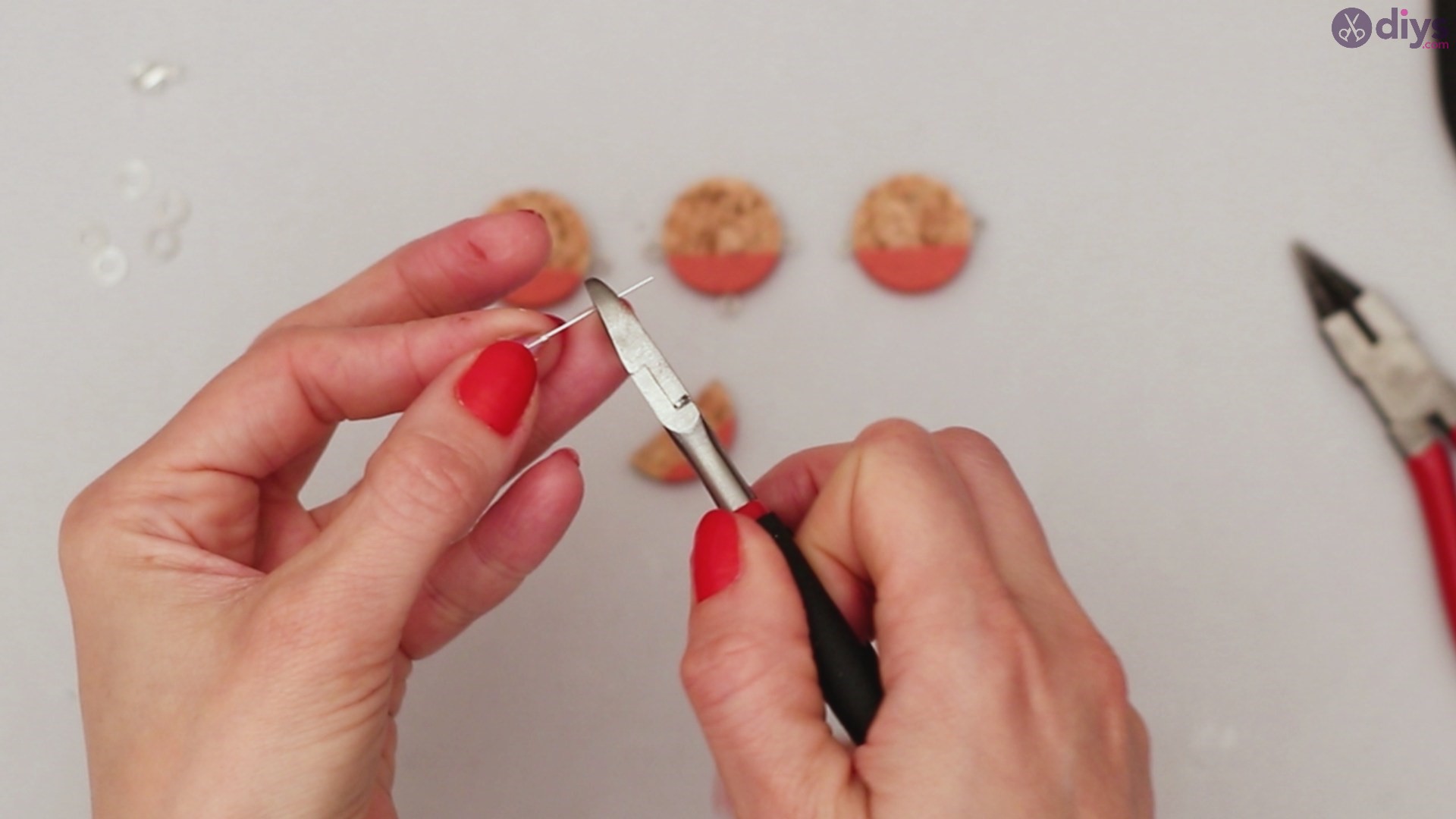 We’re going to start assembling the pieces as soon as the wine cork slices are done drying. Take your pliers and one of the eye pins. Cut off some of the length of the pin if it’s too long. It all depends on what size eye pins you have.