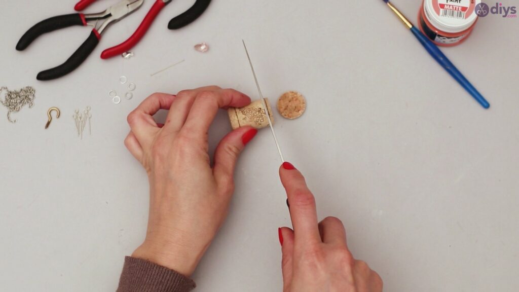 Grab the round-nose pliers, pick the eye pin and push it into the wine cork. You want the painted part to be on the bottom area, so try to measure out the middle of the cork slice – that’s the spot you want to push the eye pin in.