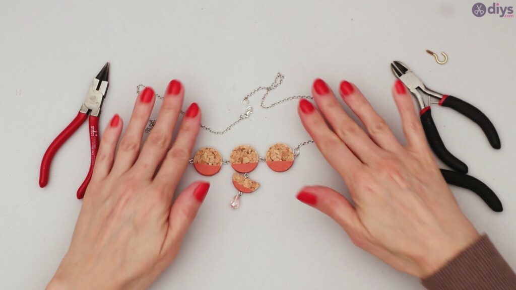 Get another jump ring, open it up with the pliers, and then push it through the link at the other end of the necklace. Through the same loop also push through the eye pins in one of the wine corks. Tightly close the loop.