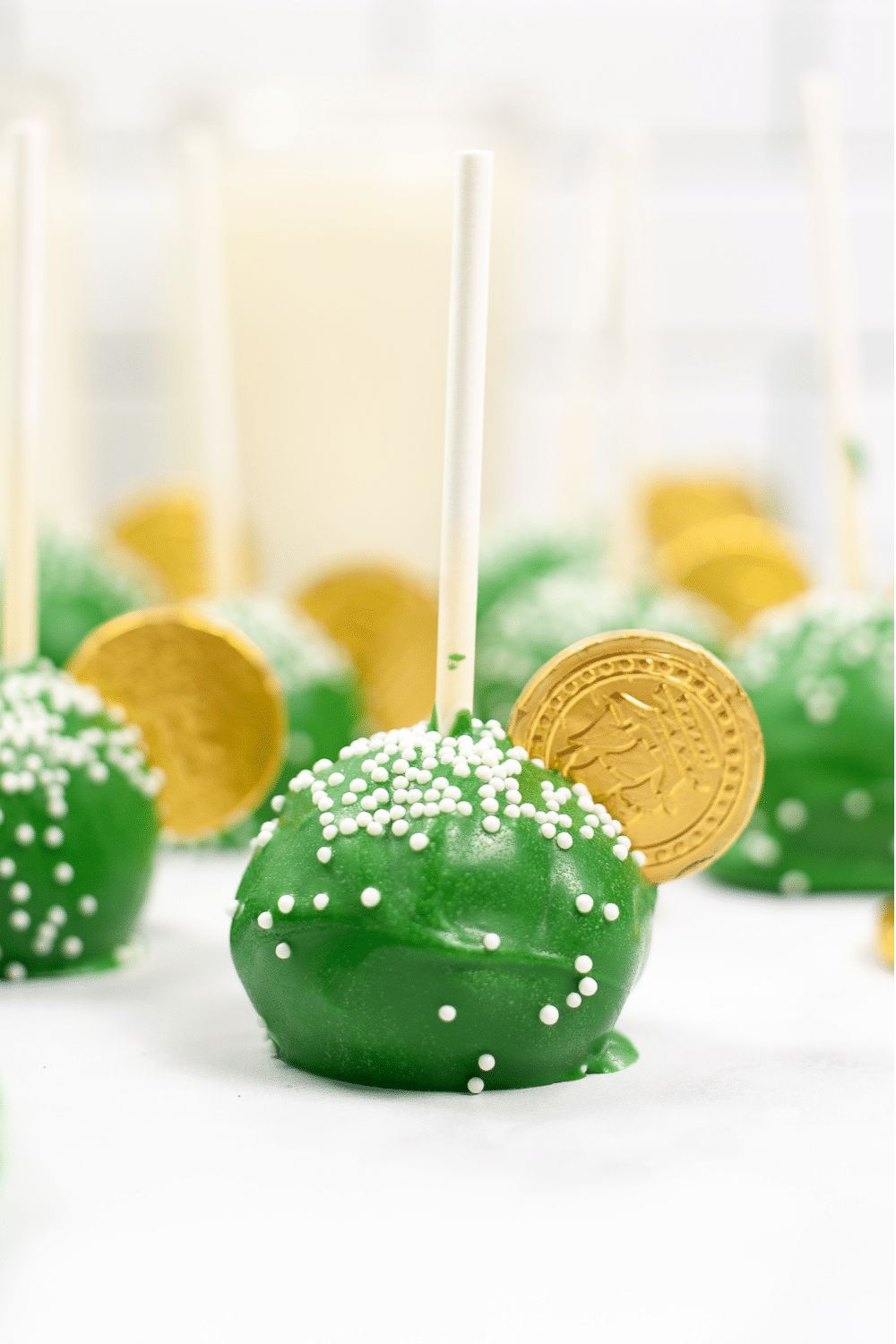 Green cake pops with gold coins are festive cake pops made with colorful green icing and topped with edible gold coins, perfect for St. Patrick’s Day snacking. The list of ingredients mentions baked white cake, cream cheese frosting, green candy melts, cookie sticks, gold coins, and white sprinkles. The recipe takes 30 minutes to whip up, but only because the cream cheese frosting and white cake must already be prepared. So these green velvet cake pops will take longer when making everything from scratch. Consider reducing the preparation time by using store-bought white cake mix and cream cheese frosting. Visit Inspiring Savings for measurements and directions.