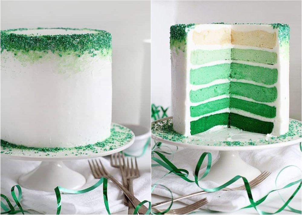 A green ombre cake is a stunningly beautiful St. Patrick’s Day cake with distinct layers of rich, vibrant green icing arranged in a gradient pattern. The list of ingredients for this dessert calls for homemade white cake or white cake mix, green food coloring, and white frosting. The secret lies in the assembly. Visit I Am Baker for measurements and directions.