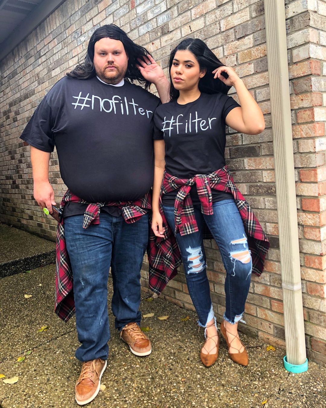 This couples Halloween costumes idea is hilarious: #filter and #nofilter. It is culturally appropriate, too, since it depicts a real-life story that often happens online. One half wears a #filter T-shirt, which shows a gorgeous face with pristine makeup and perfect hair.