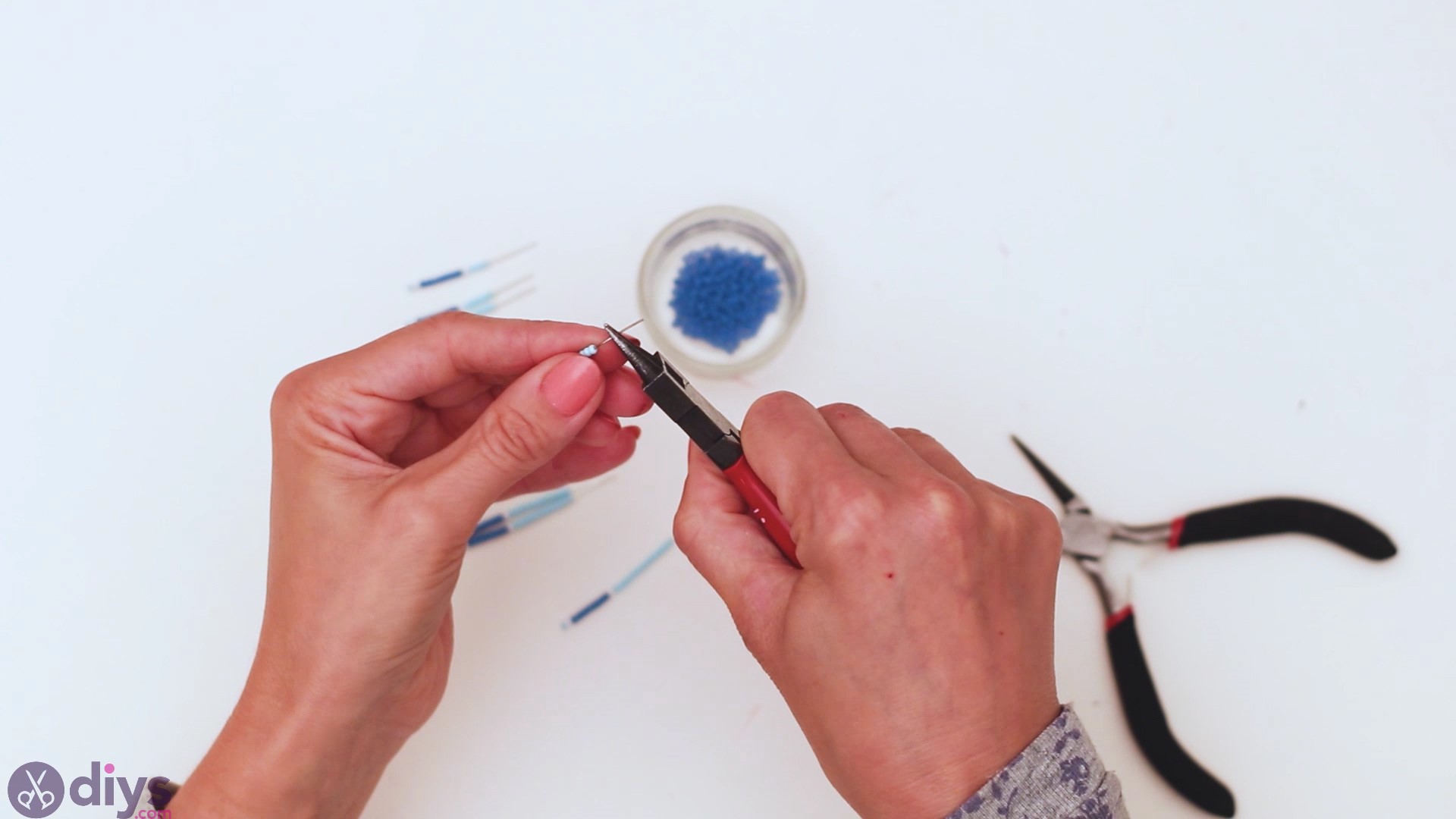 Next, we need to start rolling the wire on the head pins. So, get the round-nose pliers and pick up the head pins one by one. Place the nose of the pliers a bit above the point where the seed beads lie and turn the wire to create a loop. Before you complete the loop, cut the excess wire.