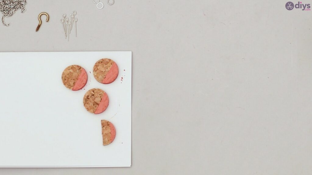 With two of the four wine cork pieces connected, you want to go to the next step now – connecting all the wine cork slices. Grab your round-nose pliers and one of the painted slices. Push the nose through the eye pin and, holding the cork tightly, open up the loop.