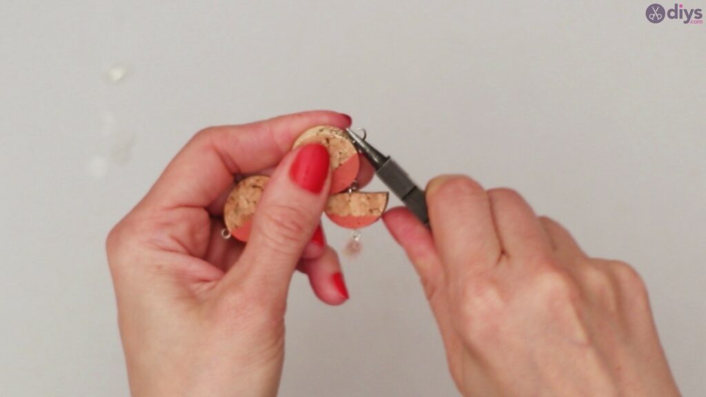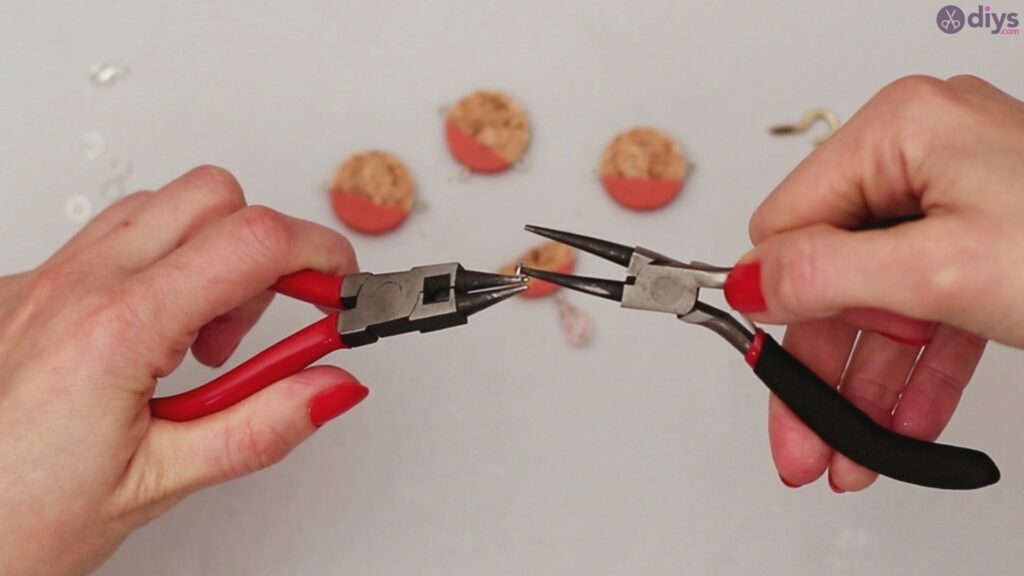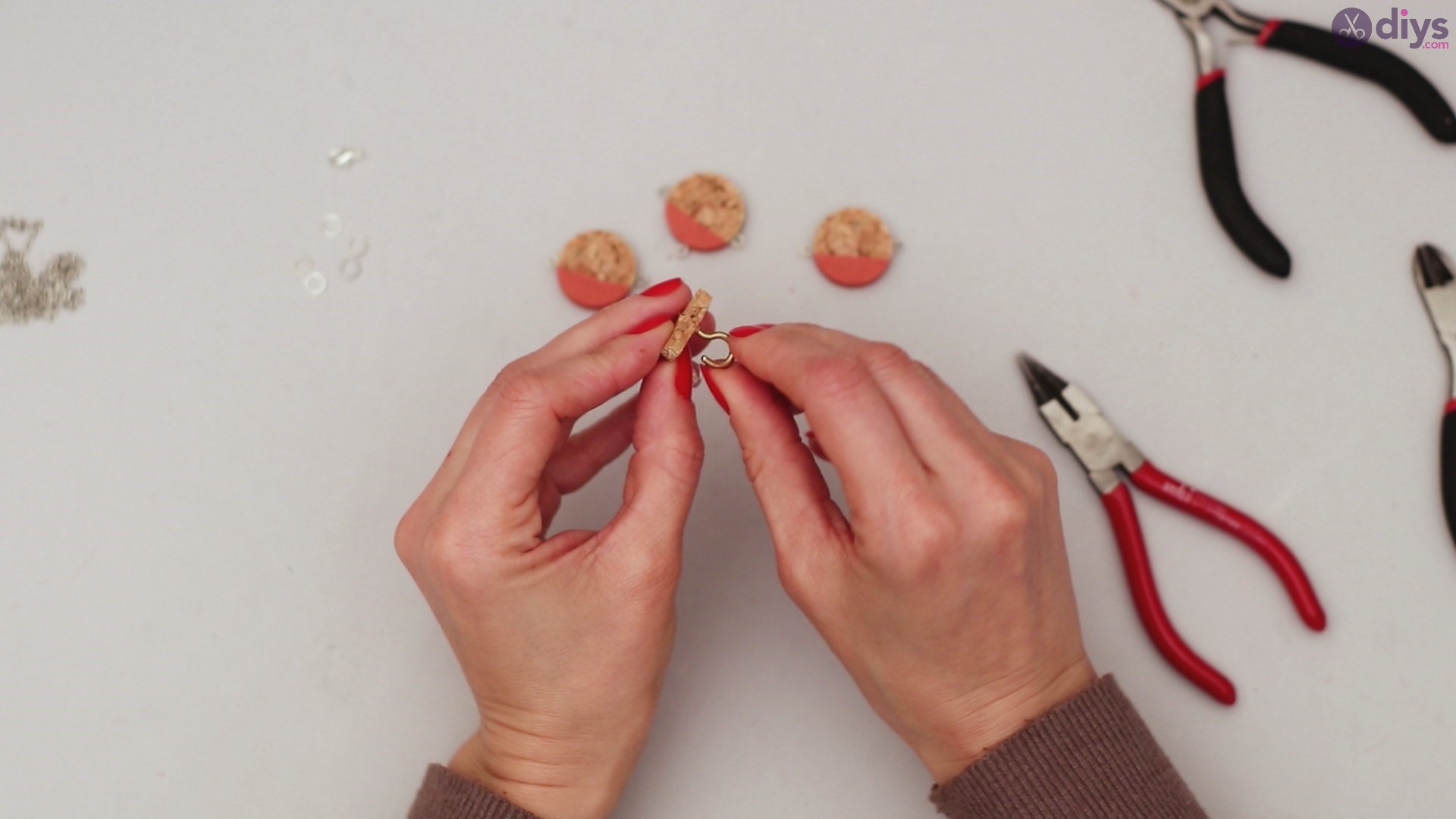 Once more, use your pliers to return the jump ring to a more natural shape. Hold the cork slice with one of the pliers and pick up another cork slice – the one with three eye pins. Push the jump ring through the bottom eye pin.