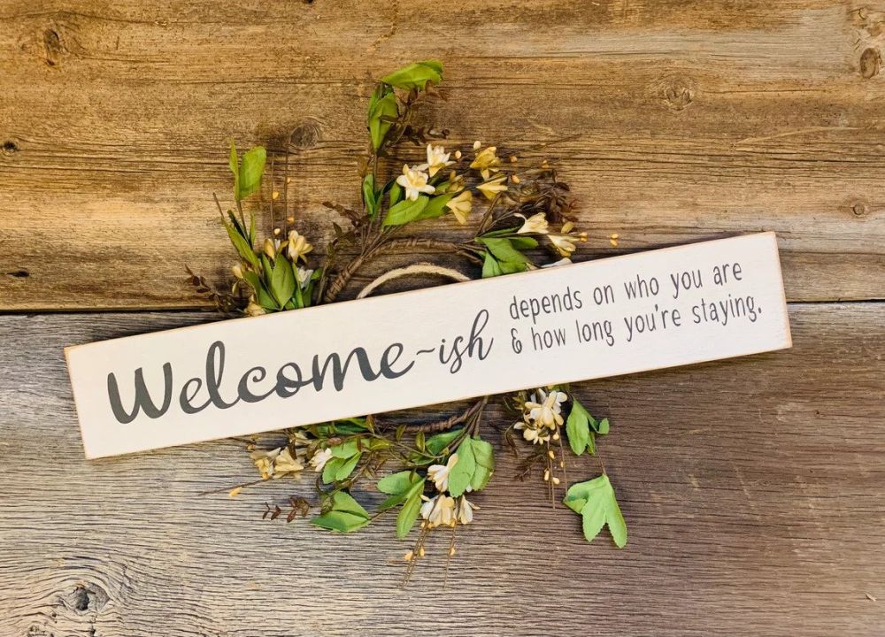 Another welcome home sign idea that has a rustic twist to it is this one sold on Etsy. Well, only the idea is sold since you have to make the project from the ground up, but we love the funny message that says Welcome-ish, depends on who you are & how long you’re staying.