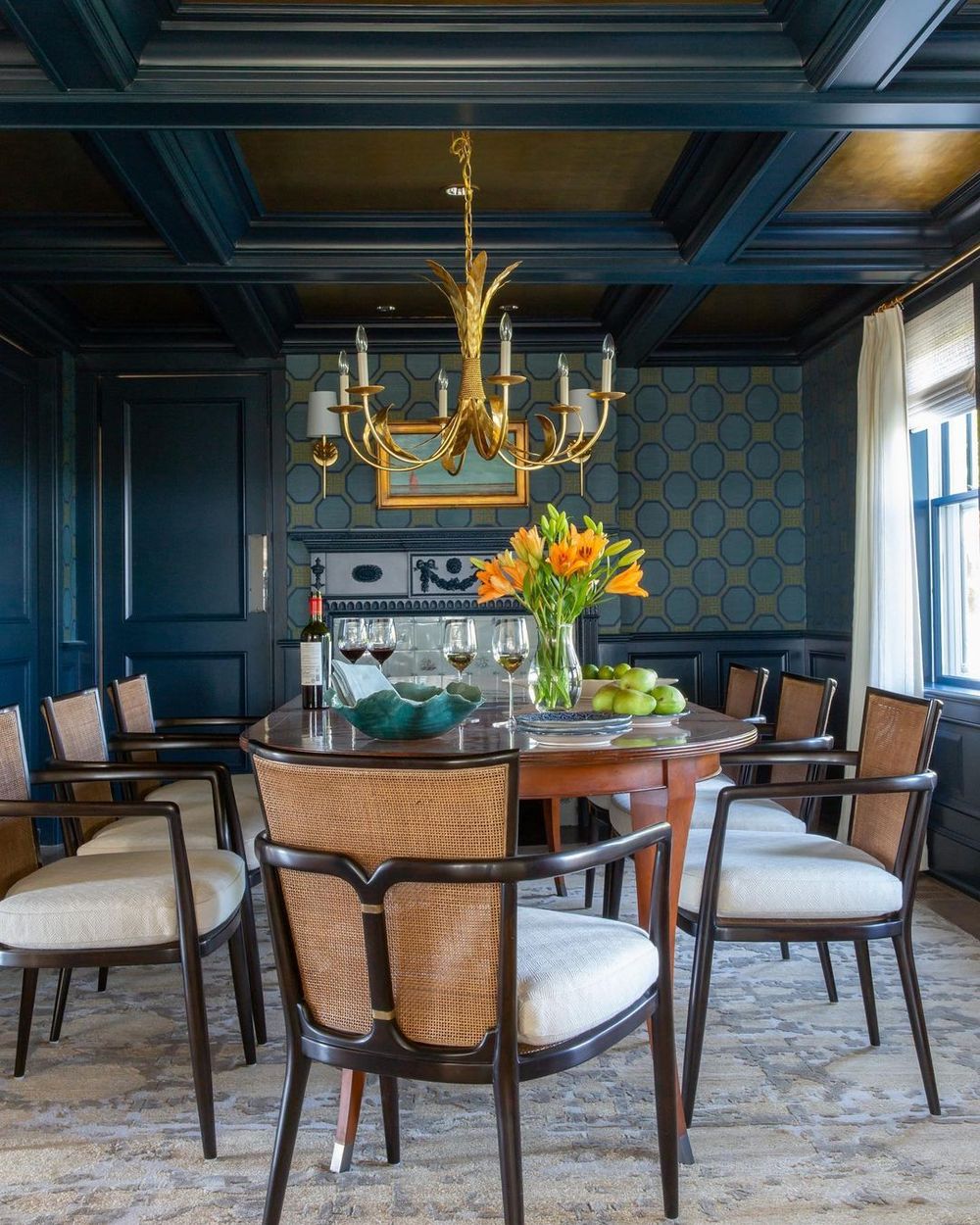 For those who want to incorporate ceiling decoration ideas into their home, look no further than the image uploaded by @interiorsaddict. It shows an interesting design with deep and curvy coffers, which are nicely complemented by a modern hanging light fixture in metallic gold.