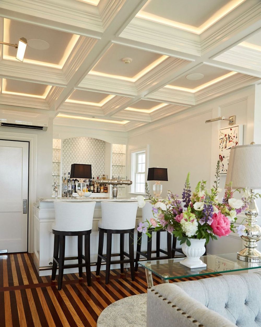 The drop coffered ceiling features coffers that are not as deep and only go a few inches down from the ceiling’s surface. As a result, it can make a room look larger while lending a bit of extra architectural interest by breaking up the space with its recessed design, mainly if you use contrasting materials.