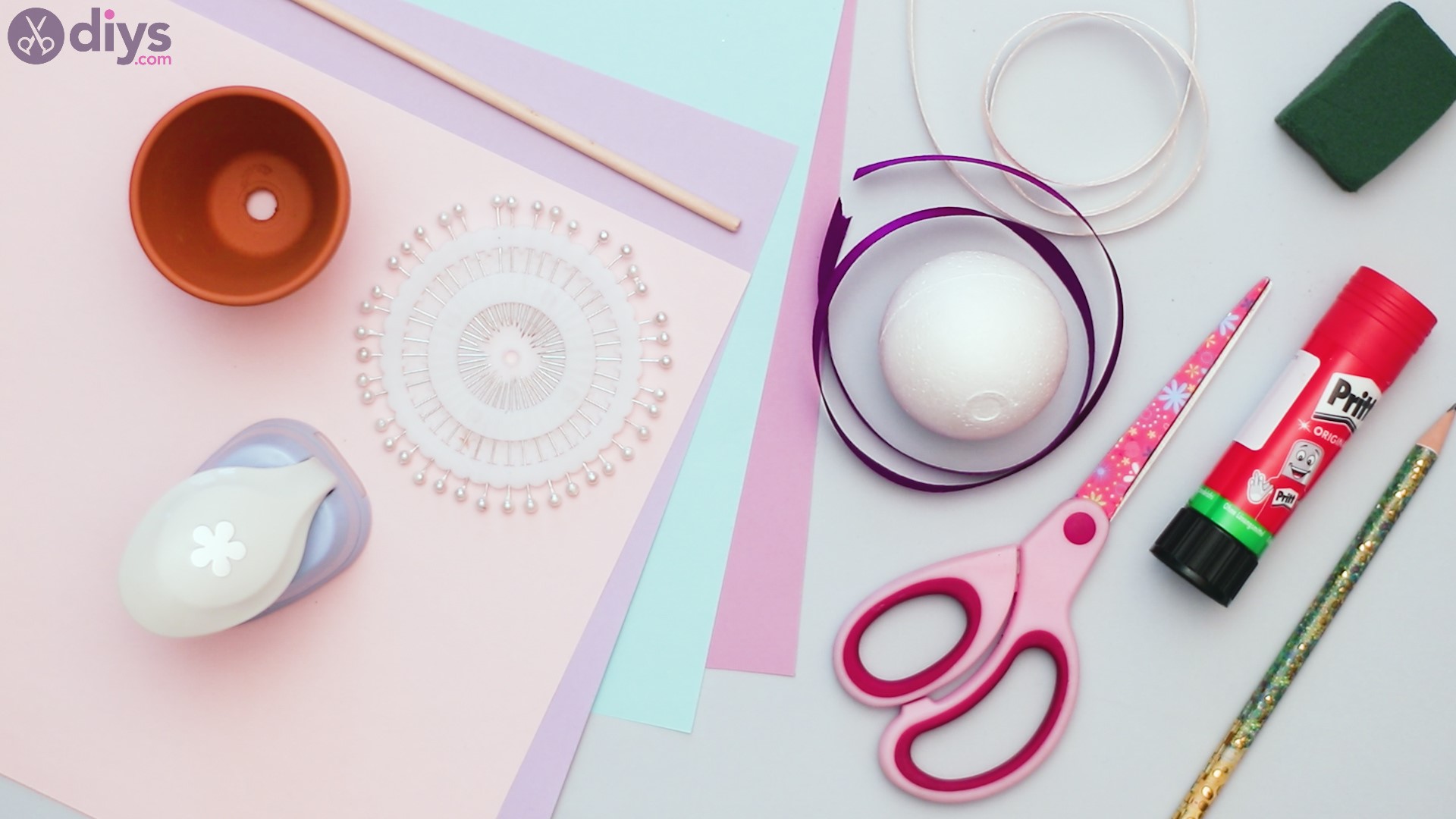 - Scale up the design: Our DIY project creates a small decoration, but feel free to use a bigger terracotta pot, polystyrene ball, and wooden dowel to produce a larger design. Use numerous tiny paper flowers or design big 3D paper flowers to add texture and interest.