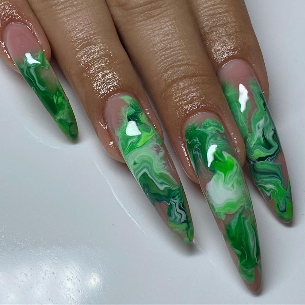Topping off our list of best green nail designs is this playful combination made by @amyle.nailsthat brings together green, white, and nude nail polish to create a swirl of colors and shades.
